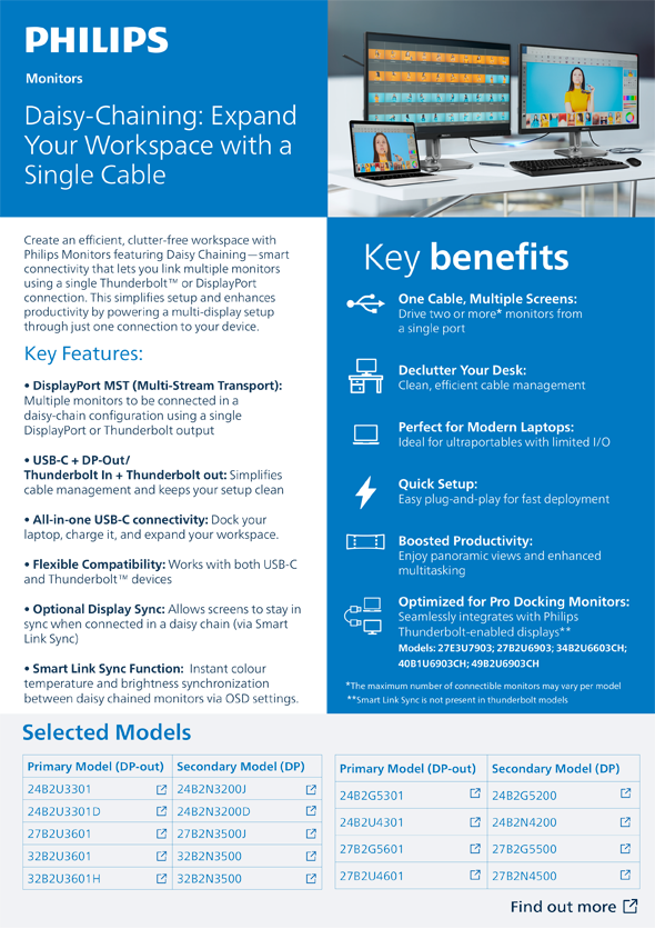 Recognised for their cutting-edge technologies, such as QD-OLED or MiniLED panels, Thunderbolt 4 connectivity, hi-res webcams with facial recognition, innovative “Busylight” for professional settings, Philips monitors are favoured by both consumers and businesses.